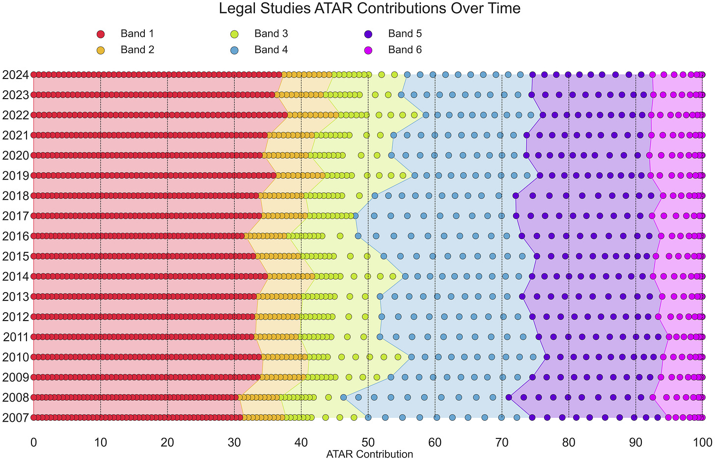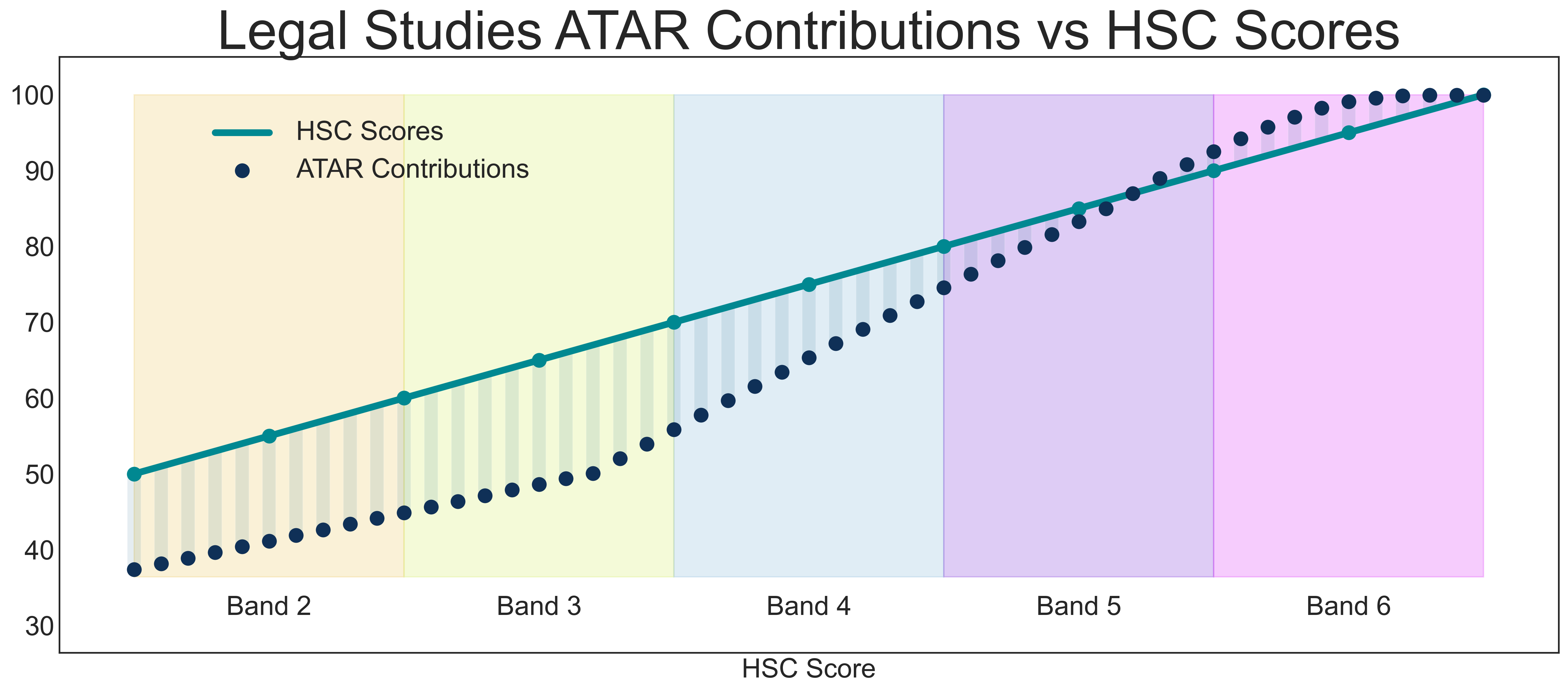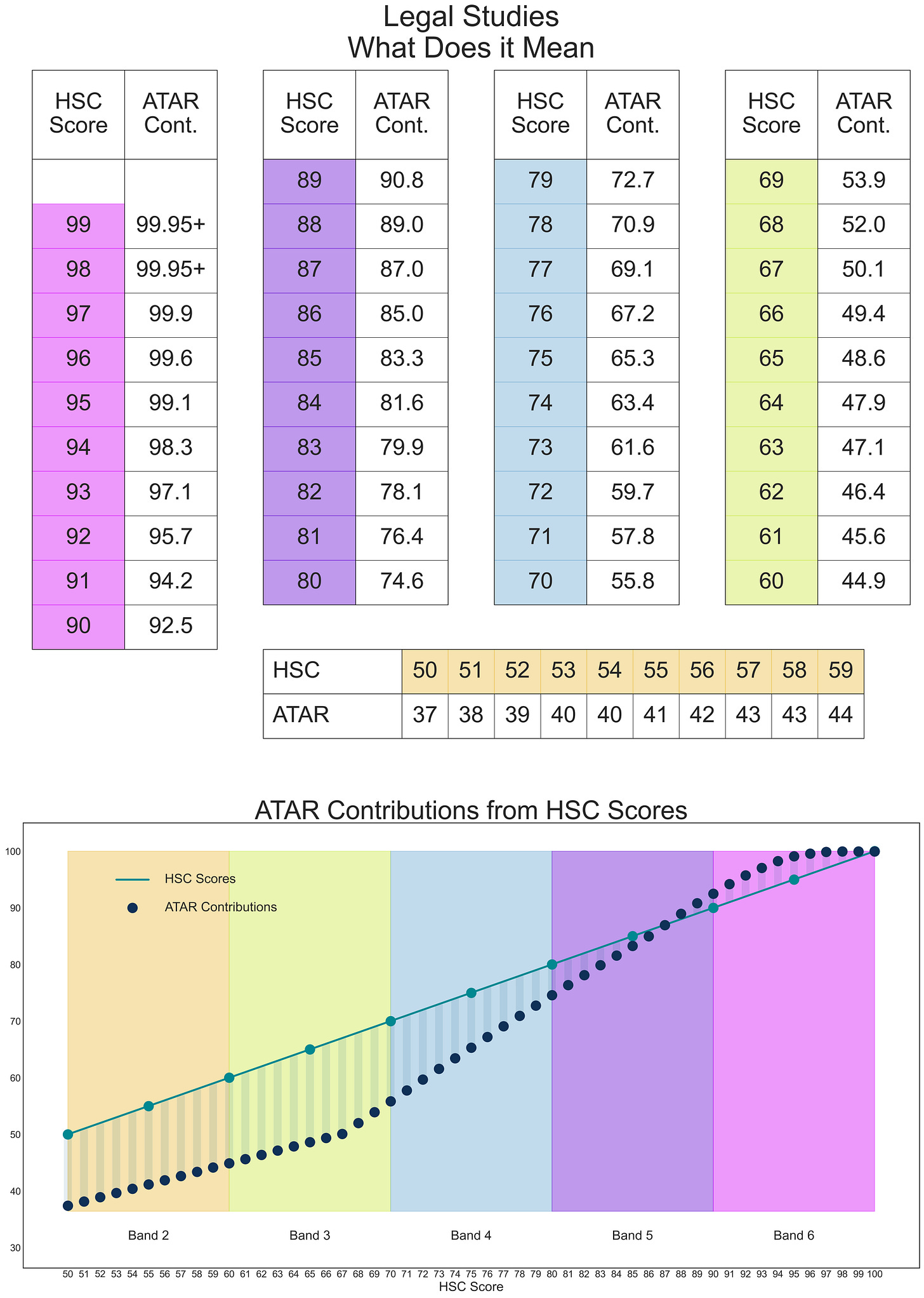 Here’s a look at how Legal Studies has scaled over time, comparing HSC scores to ATAR contributions.