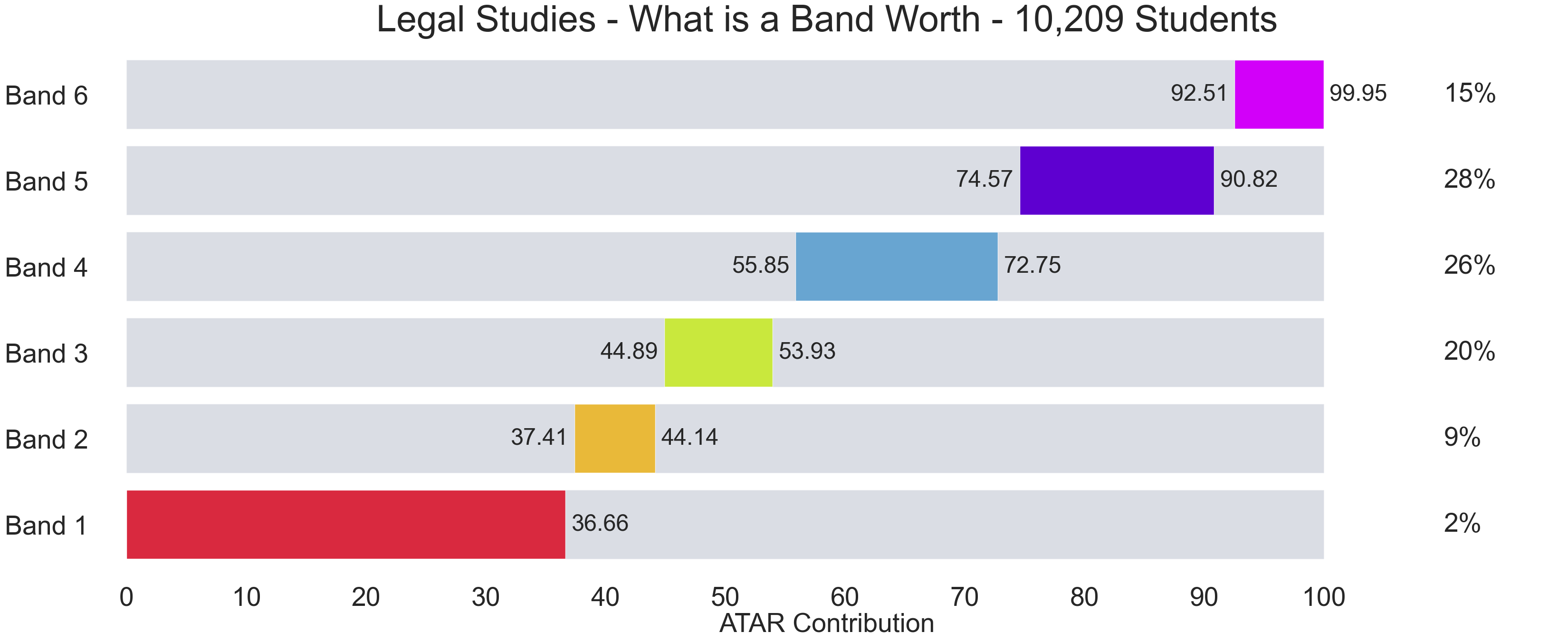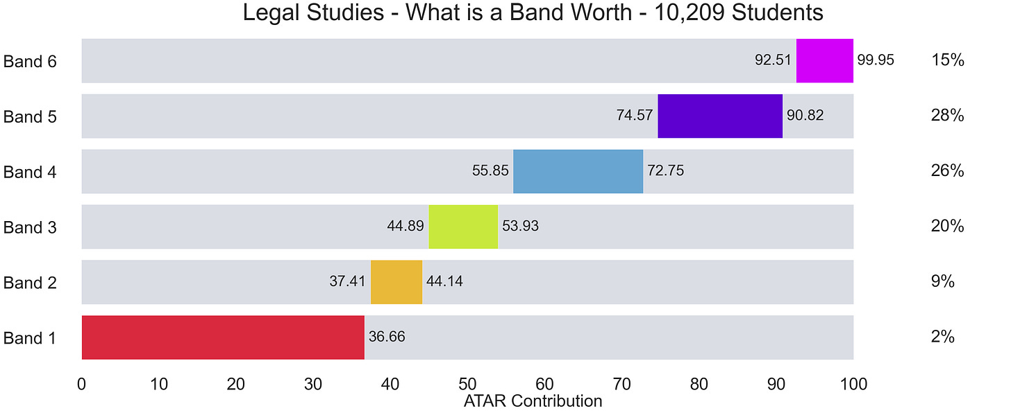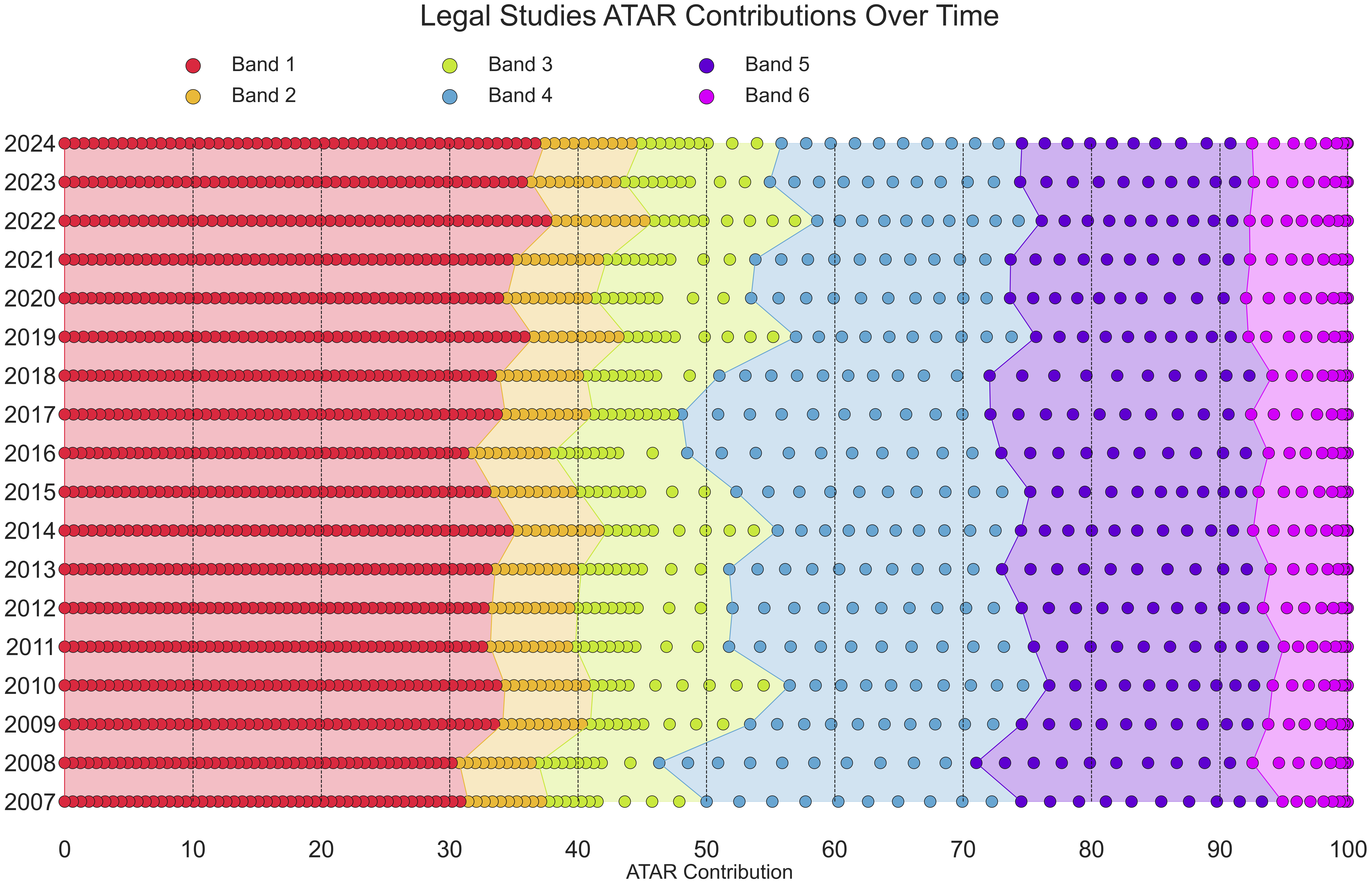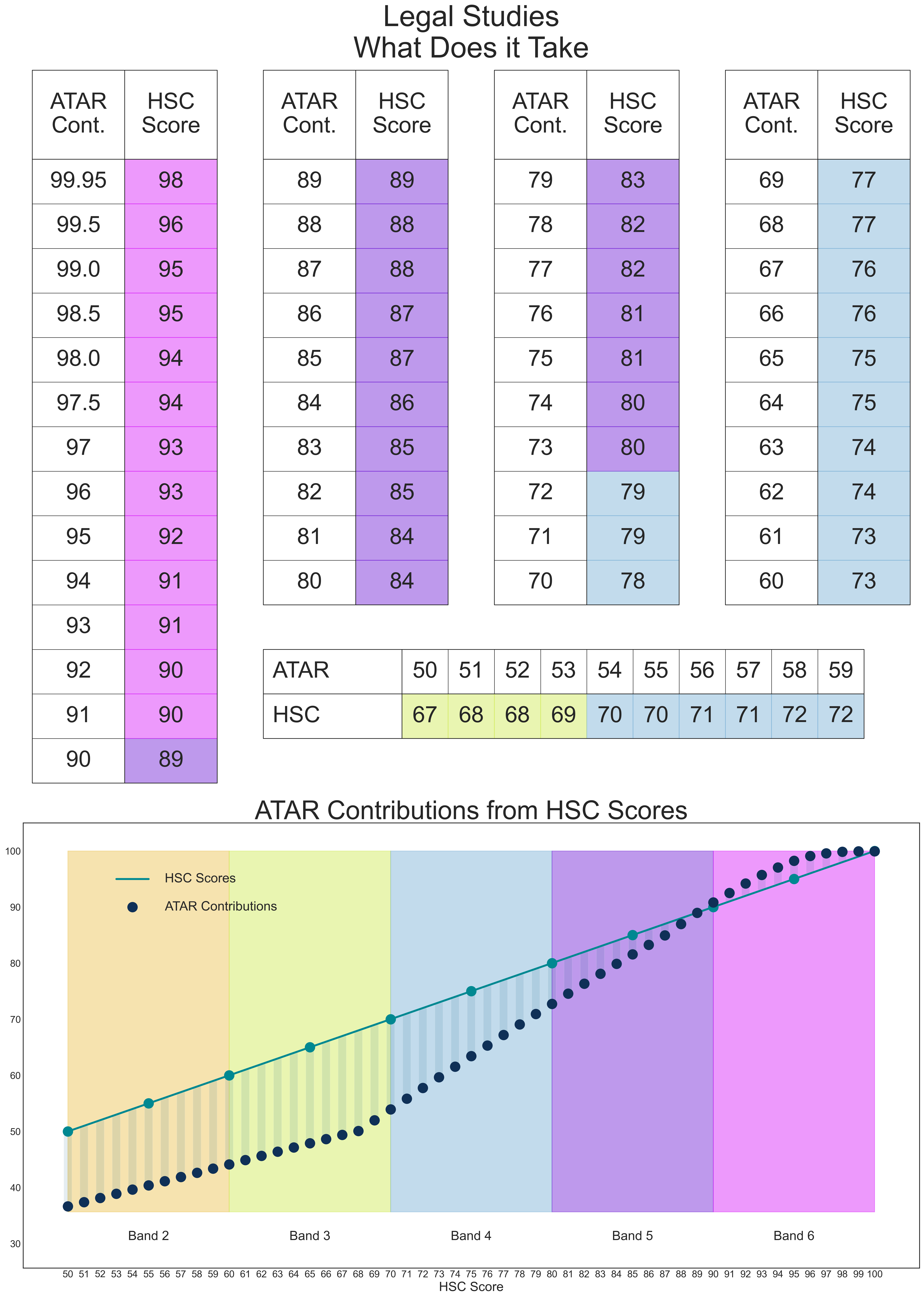 Here’s a look at how Legal Studies has scaled over time, comparing HSC scores to ATAR contributions.