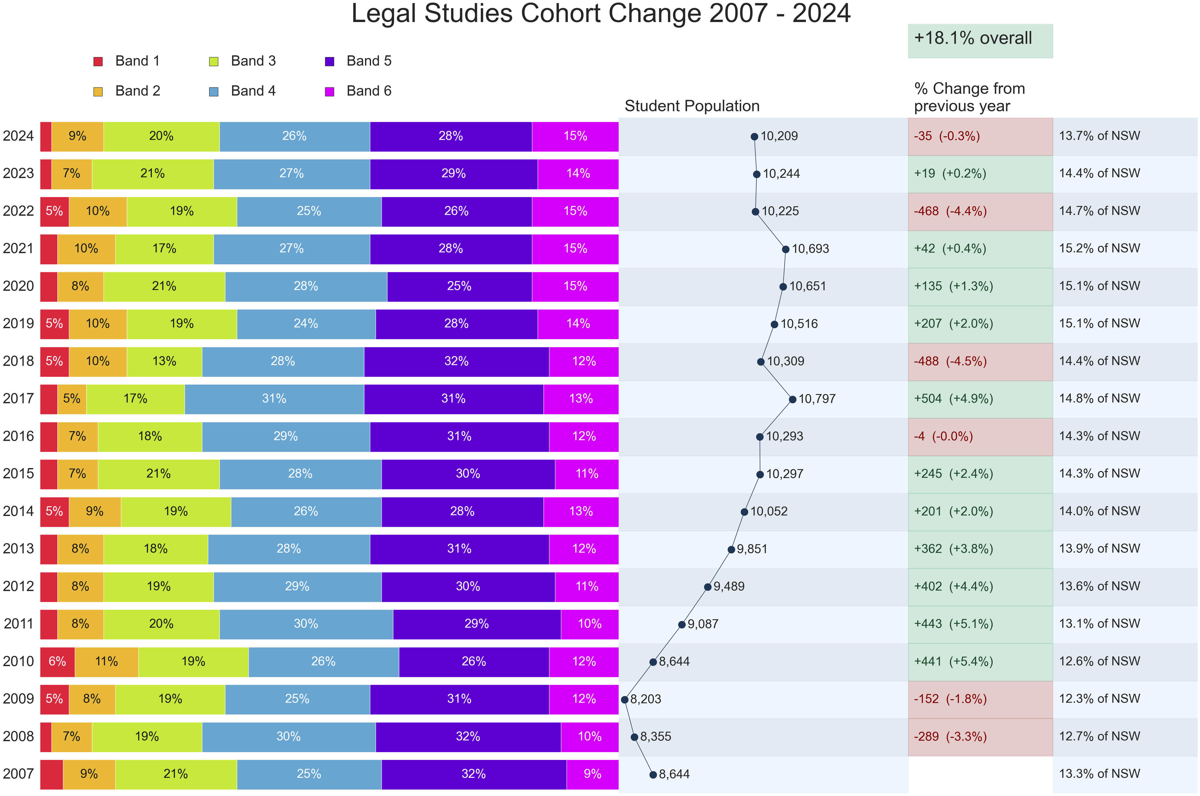 The proportion of students studying Legal Studies has slightly increased from 2007, although the general trend in enrolments over the last few years has been one of slight decline. Still, with over 13% of HSC students studying Legal Studies, it’s a subject with a strong candidature. The proportion of Band 6 scores has risen fairly significantly, from around 9% in 2007 to 15% in 2024. It looks to me like the increase in Band 6 scores has really just been Band 6 eating up what used to be high Band 5 scores, but we need to see the change in scaling to get a sense of that.