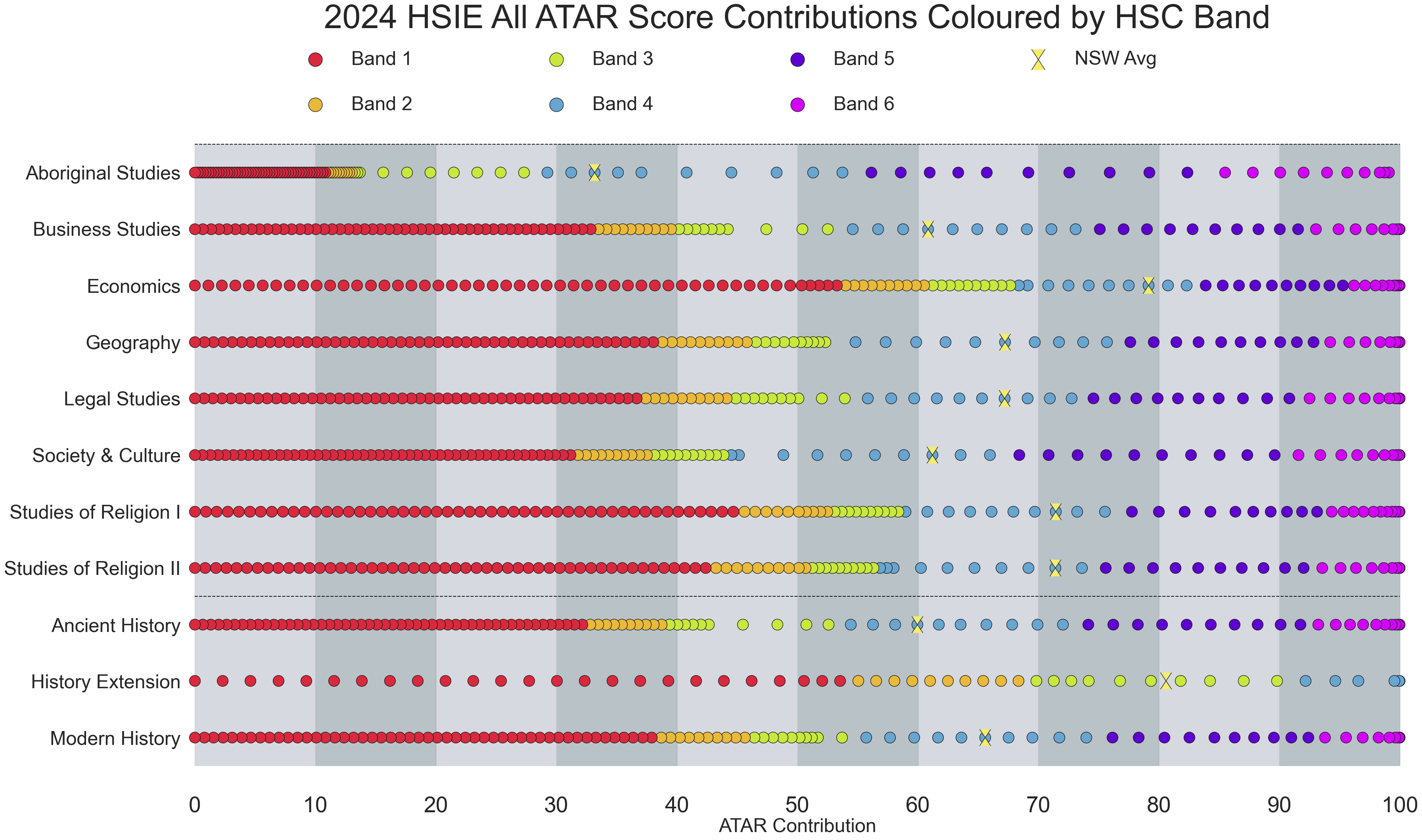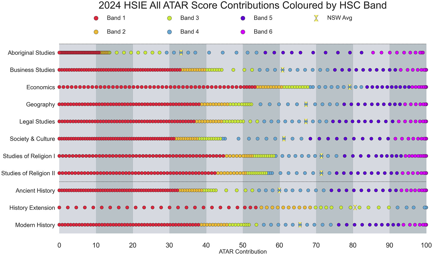 HSIE subjects tend to scale pretty similarly and be marked by NESA at fairly similar standards. Economics and Aboriginal Studies stand out as otherwise, but others are fairly similar. Legal Studies sits right in there with the others. That’s just a benign thing about HSIE subjects. In scaling terms, they’re a little boring, but that’s just because they’re similar and predictable. I like it that they’re boring in those terms.